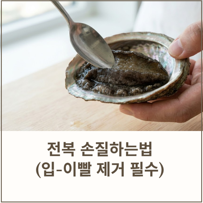 - 이빨 제거(필수): 내장을 제거한 후 전복 끝부분에 있는 입 구조에 칼집을 내거나 손으로 눌러 단단한 이빨과 식도를 제거합니다.