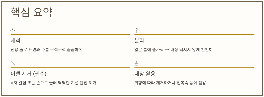복잡해 보였던 전복 손질하는법도 단계별로 정리하면 생각보다 어렵지 않습니다. 오늘 핵심 내용을 다시 한번 정리해 드립니다.