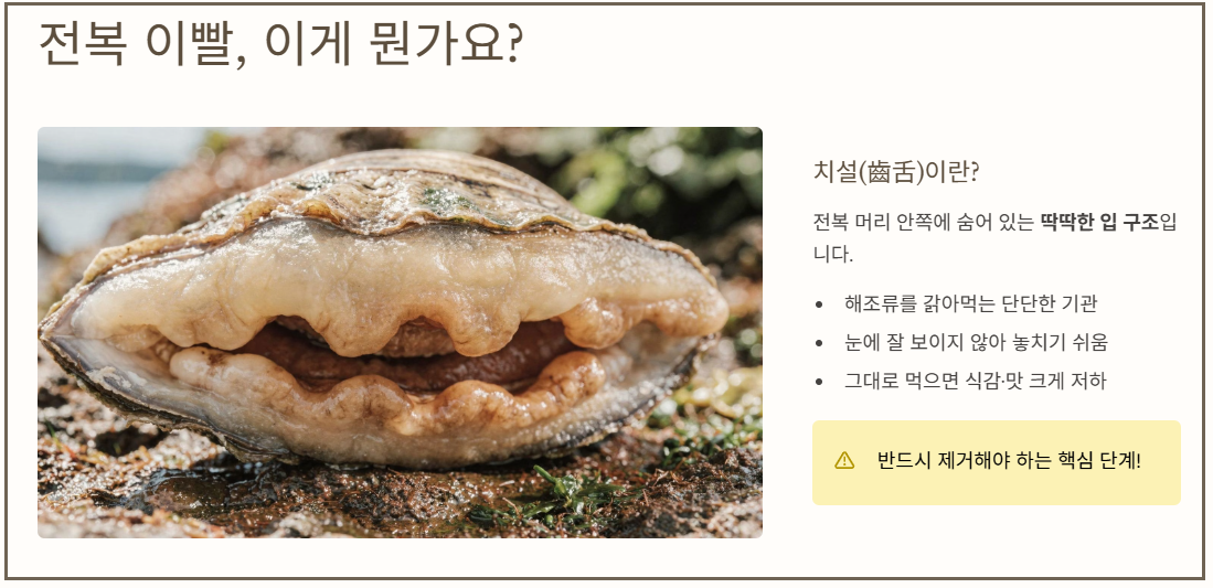 전복의 머리 부분 안쪽에는 해조류를 갉아먹는 단단한 입 구조(치설)가 자리하고 있는데, 이 부분은 매우 질기고 딱딱해 그대로 섭취할 경우 식감이 크게 떨어질 수 있습니다.
