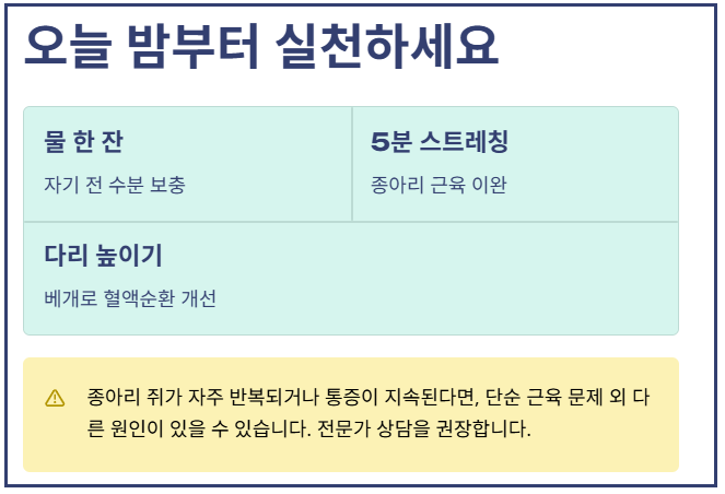 오늘 소개한 스트레칭, 수분 섭취, 생활 습관 개선을 실천하면 종아리 쥐는 충분히 예방할 수 있습니다.