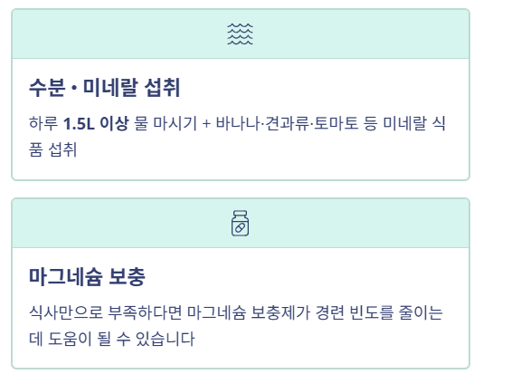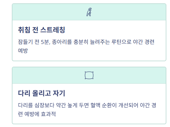 잠들기 전 5분 정도 종아리를 충분히 늘려주는 습관을 들이세요. 꾸준히 실천하면 야간 경련 예방에 도움이 됩니다. - 수분과 미네랄 섭취