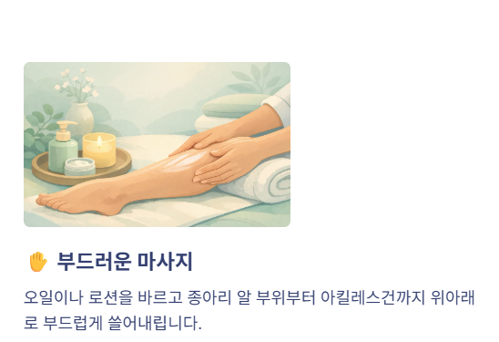 오일이나 로션을 바른 뒤, 종아리 알 부위부터 아킬레스건까지 위아래로 부드럽게 쓸어내리듯 마사지합니다. 강하게 누르는 것은 오히려 근육에 부담을 줄 수 있습니다.