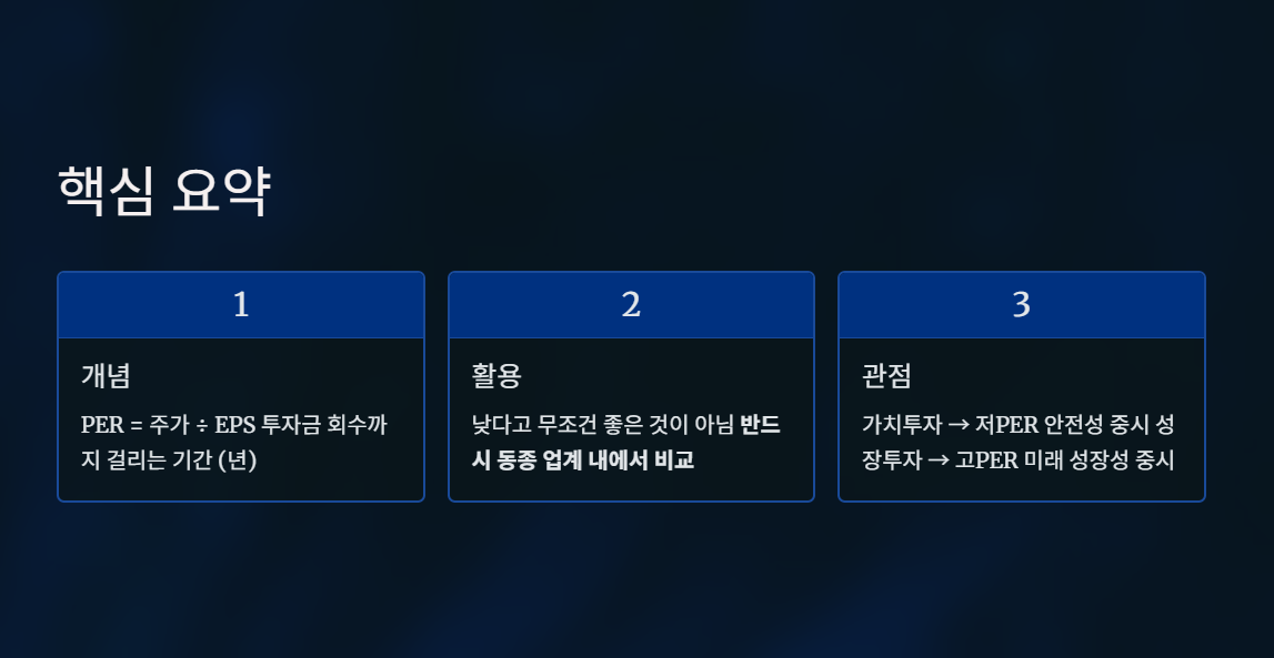 - 활용: 무조건 PER이 낮다고 좋은 주식, 높다고 나쁜 주식이 아닙니다. 반드시 동종 업종 내에서 비교 평가해야 합니다.