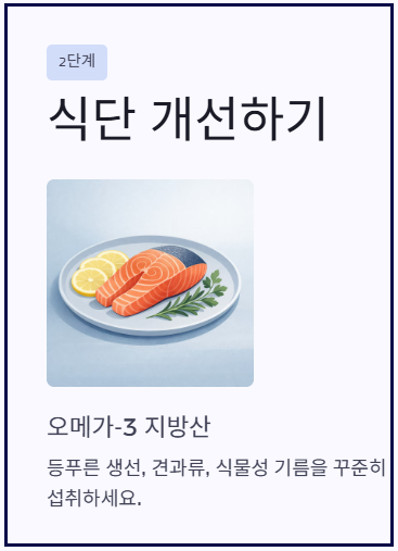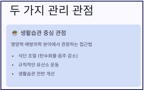 탄수화물 섭취를 줄이고, 오메가-3가 포함된 식단과 규칙적인 유산소 운동을 병행하면 관리에 도움이 됩니다. - 관리 및 치료 방향