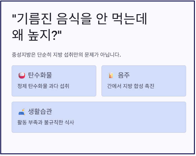 “기름진 음식을 많이 먹지도 않는데 왜 수치가 높지?”라는 의문을 가지는 분들이 많습니다. 실제로 중성지방은 단순히 지방 섭취뿐 아니라 탄수화물, 음주, 생활습관 등 다양한 원인의 영향을 받습니다.