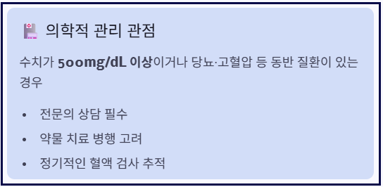 반면 중성지방 수치가 매우 높거나(예: 500mg/dL 이상), 당뇨·고혈압 등 다른 질환이 함께 있는 경우에는 보다 적극적인 관리가 필요할 수 있습니다. 이러한 경우에는 전문의 상담을 통해 약물 치료를 포함한 관리 방법을 고려하기도 합니다.
