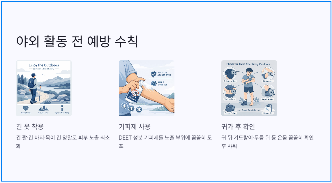 예방의학 및 보건 전문가들은 백신이 없는 질병인 만큼 '환경 통제와 노출 최소화'가 가장 효과적인 예방법이라고 설명합니다. 야외 활동 시 긴 팔, 긴 바지, 목이 긴 양말을 착용해 피부 노출을 줄이고, 진드기 기피제 사용, 풀밭에 직접 앉지 않는 등의 생활 수칙 준수가 핵심이라는 관점입니다.