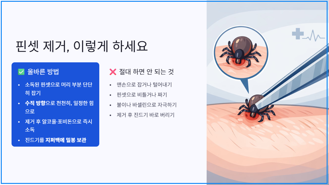 흔하게 하는 실수 중 하나는 놀라서 맨손으로 진드기를 털어내거나 제거하는 것입니다. 이 경우 진드기의 일부가 피부 속에 그대로 남아 2차 감염이나 염증으로 이어질 수 있습니다.