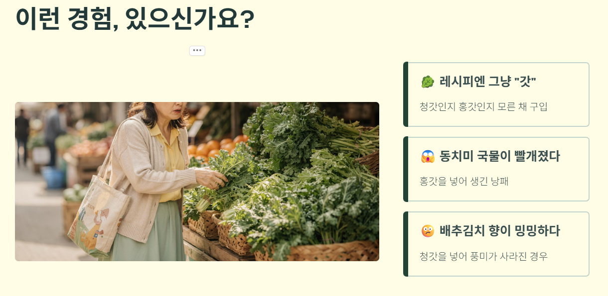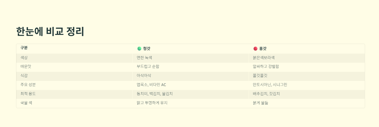단순히 맛의 취향을 넘어, 요리의 색감과 보존성까지 고려하면 청갓과 홍갓의 쓰임새는 분명하게 나뉩니다. 요리 목적에 따라 두 식재료의 차이와 활용법을 쉽게 정리해 드립니다.