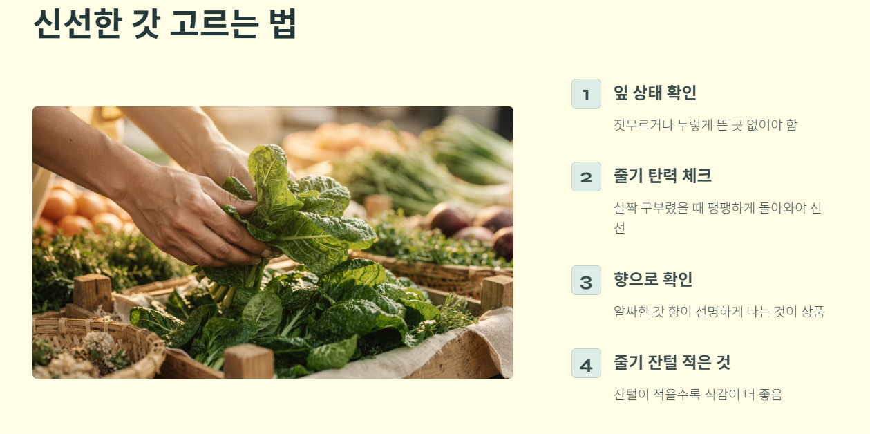- 신선도 확인하기: 잎이 짓무르거나 누렇게 뜬 곳이 없는지 확인합니다. 줄기를 살짝 구부렸을 때 탄력이 있고, 갓 특유의 알싸한 향이 선명하게 나는 것이 신선한 갓입니다. 줄기에 잔털이 적은 것을 고르는 것이 식감에 좋습니다.