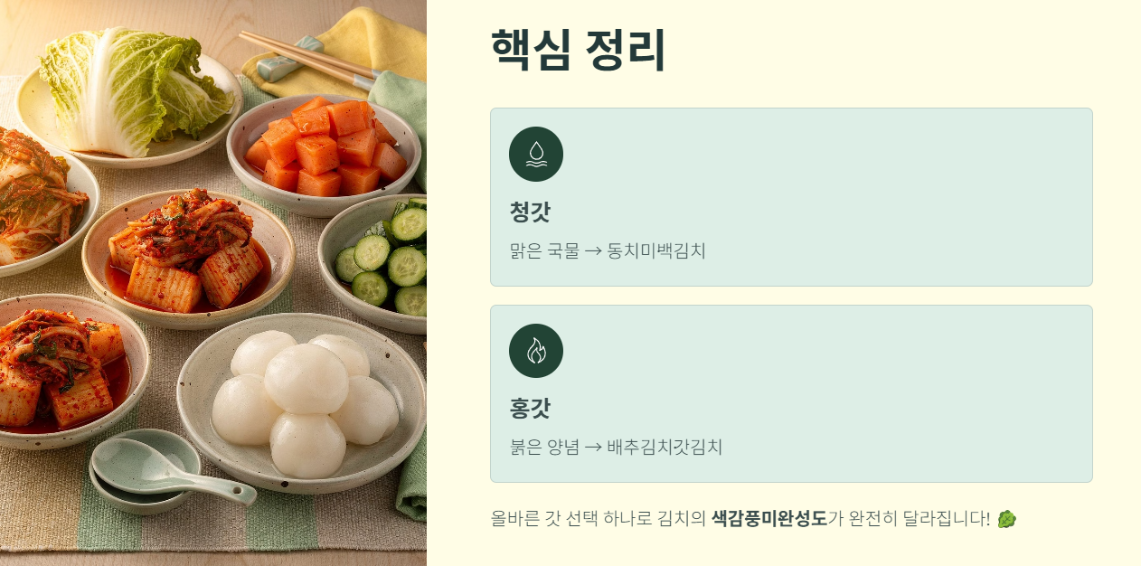 청갓은 부드러운 맛과 색이 묻어나지 않는 특성 덕분에 맑은 국물의 동치미나 백김치에 적합하며, 홍갓은 강렬한 매운맛과 붉은 색감으로 배추김치 속이나 갓김치를 담글 때 최적화된 식재료입니다. 갓을 잘못 선택하면 요리의 시각적, 미각적 완성도가 크게 떨어질 수 있습니다. 조리하고자 하는 김치의 특성을 명확히 파악하고, 그에 맞는 갓을 선택하여 요리의 깊이를 더하시기 바랍니다.