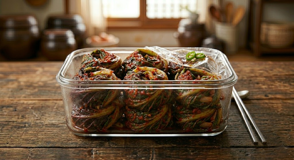 - 공기 차단: 김치통에 담은 후, 남은 겉잎이나 위생 비닐을 덮어 공기와의 접촉을 완벽히 차단하여 산화를 막습니다.