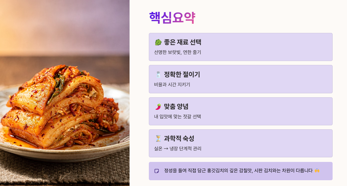 지금까지 재료를 고르는 단계부터 맞춤형 양념, 과학적인 숙성 과정까지 홍갓김치를 맛있게 담그는 전 과정을 자세히 살펴보았습니다. 다소 번거롭게 느껴질 수 있지만, 정성을 들여 직접 담근 김치가 주는 깊은 감칠맛과 건강함은 시판 김치와는 쉽게 비교할 수 없습니다.