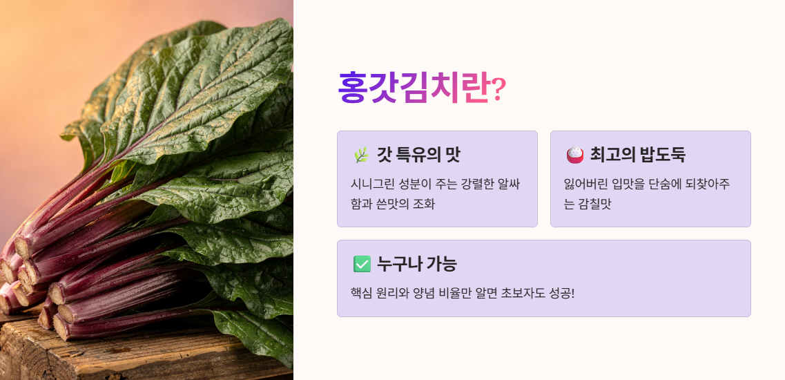 다가오는 주말, 우리 집 식탁을 한층 더 풍성하고 특별하게 만들어줄 홍갓김치 담그기에 한 번 도전해 보시는 건 어떨까요?