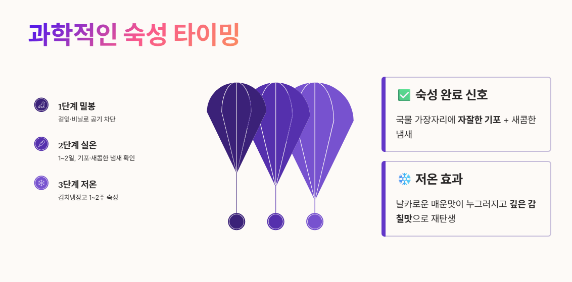 - 저온 숙성: 기포가 확인되면 즉시 김치냉장고로 옮겨 1~2주일간 천천히 저온 숙성합니다. 이 과정을 거치면 날이 선 매운맛은 누그러지고 깊은 맛으로 재탄생합니다.