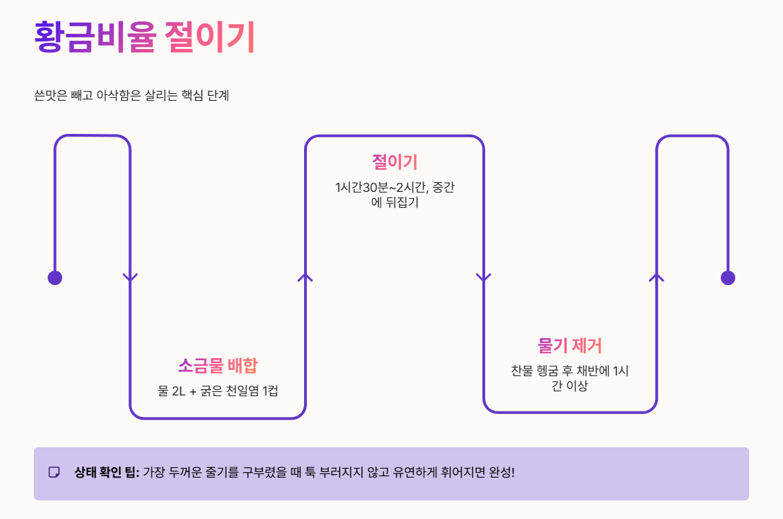 거친 쓴맛을 중화시키고 양념이 속까지 잘 배어들게 하려면, 정확한 소금 비율과 시간이 중요합니다.