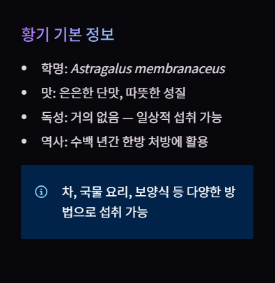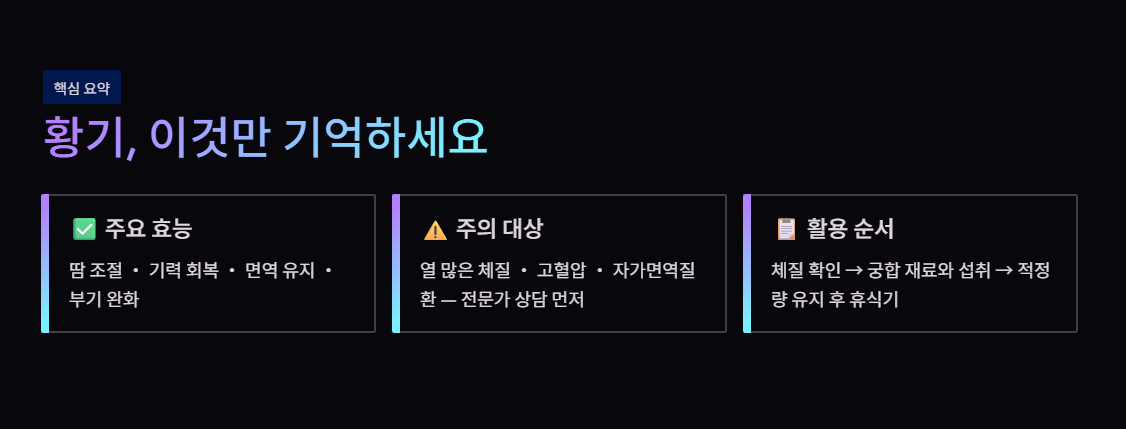 올바르게 활용한다면 황기는 바쁜 일상 속에서 건강 관리를 돕는 자연스러운 보조 식재료로 활용될 수 있습니다.