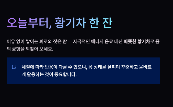 특히 이유 없이 피로가 쌓이고 몸이 쉽게 지치는 경우, 커피나 자극적인 에너지 음료 대신 따뜻한 황기차를 선택하는 것도 하나의 방법이 될 수 있습니다.