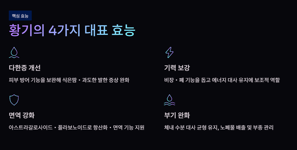 과도한 땀 분비 조절에 도움, 만성 피로 완화 및 기력 유지, 면역 기능 유지에 도움, 체내 수분 대사 및 부기 관리 보조 - 부작용 및 주의사항: 황기는 일반적으로 안전한 약재로 알려져 있지만, 체질에 따라 주의가 필요할 수 있습니다.