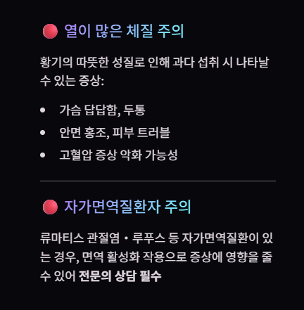 황기는 면역 기능을 활성화하는 방향으로 작용할 수 있어, 류마티스 관절염, 루푸스 등 자가면역질환이 있는 경우에는 증상에 영향을 줄 가능성이 있습니다.