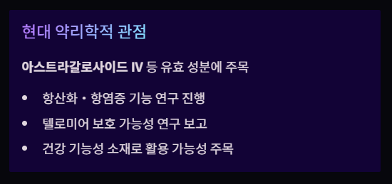 현대 약리학에서는 황기에 포함된 ‘아스트라갈로사이드 IV(Astragaloside IV)’ 등의 성분에 주목하고 있습니다.