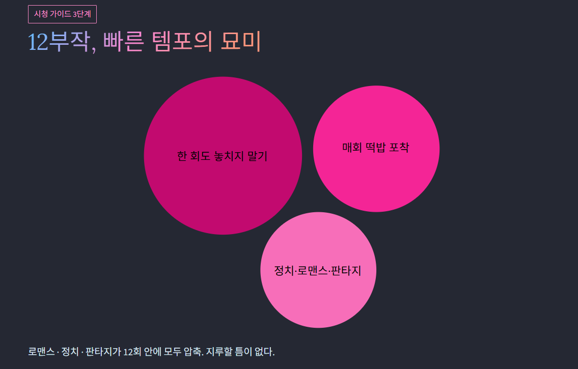 12부작이라는 짧은 분량 안에 로맨스, 정치, 판타지가 모두 녹아있습니다. 매회 던져지는 왕실 내부의 정치적 암투와 주인공들을 둘러싼 비밀이라는 '떡밥'들이 지루할 틈 없이 빠르게 회수될 것입니다. 전개가 빠른 만큼 한 회도 놓치지 않고 템포에 맞춰 따라가는 것이 핵심입니다.