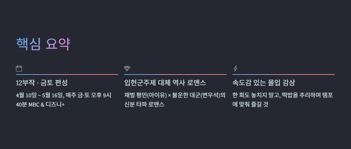 - 주요 스토리: 21세기 입헌군주제 아래, 재벌 평민(아이유)과 불운한 대군(변우석)의 운명 개척 신분 타파 로맨스.