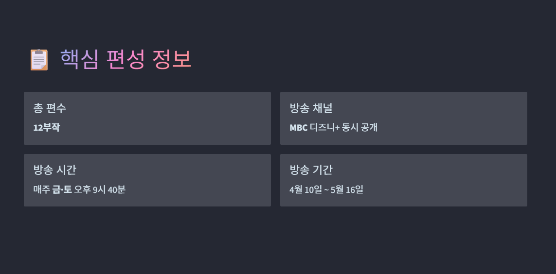 과거 16부작이 기본이었던 미니시리즈의 틀을 깨고, 최근 트렌드에 맞춰 12부작이라는 압축된 포맷을 선택했습니다. 이는 군더더기 없이 속도감 있는 전개로 시청자들의 몰입도를 극대화하겠다는 제작진의 강한 자신감이 엿보이는 대목입니다.