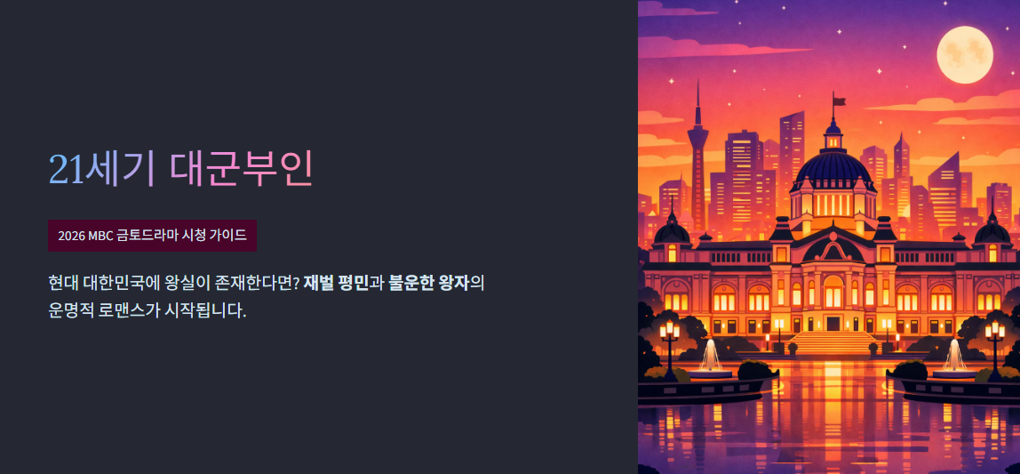 만약 21세기 현대 대한민국에 여전히 왕실이 존재한다면 어떨까요? 게다가 모든 것을 다 가졌지만 신분은 고작 '평민'이라 짜증스러운 재벌 여자와, 왕의 아들이라는 고귀한 핏줄을 가졌음에도 아무것도 가질 수 없어 슬픈 왕자의 로맨스라니, 벌써부터 가슴이 두근거리지 않나요? 드디어 2026년 4월 10일, 수많은 시청자들의 밤잠을 설치게 만들 MBC 새 금토드라마 <21세기 대군부인>이 베일을 벗습니다.