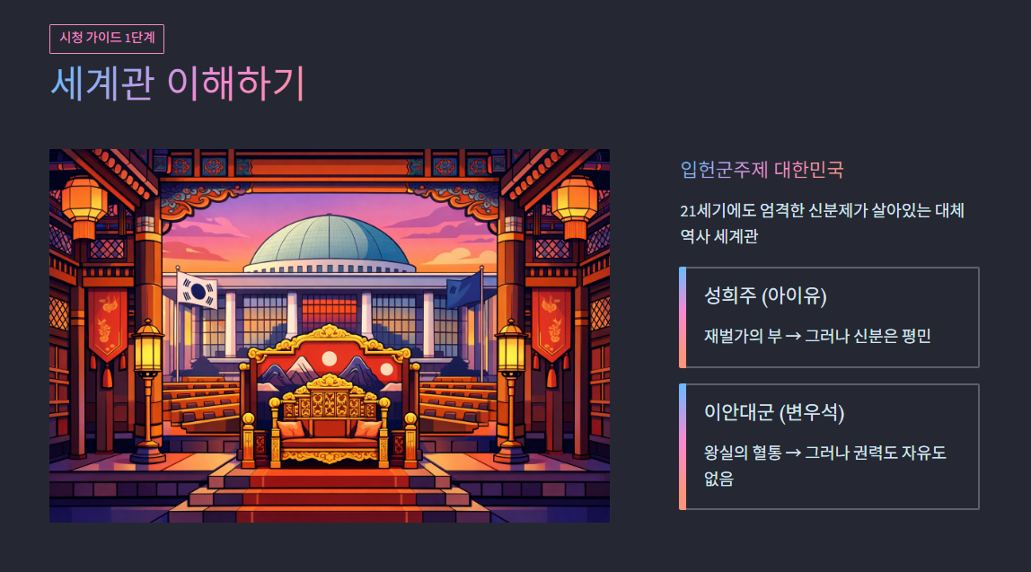 이 작품의 핵심은 철저한 계급 사회인 입헌군주제 대한민국입니다. 아이유가 연기하는 '성희주'는 굴지의 대기업을 이룬 재계 신화의 딸로 어마어마한 부를 가졌지만, 신분제 앞에서는 평민에 불과해 한계를 느낍니다. 반대로 변우석이 맡은 '이안대군'은 왕실의 직계 혈통이지만 실질적인 권력이나 자유를 누릴 수 없는 처지입니다. 이 엇갈린 배경이 두 주인공을 어떻게 엮이게 만드는지 세계관의 룰을 파악하는 것이 첫 번째 단계입니다.
