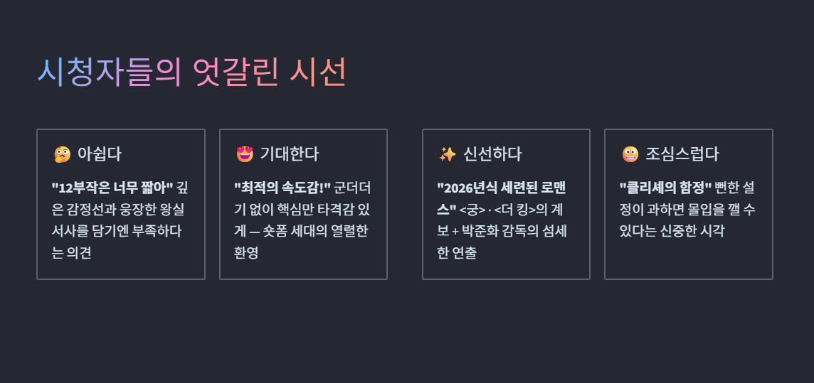 - 아쉽다는 의견: 배우들의 세밀한 감정선 변화와 웅장한 왕실의 서사를 깊이 있게 다루기엔 12부작이 너무 짧게 느껴진다는 전통적인 드라마 팬들의 아쉬움이 존재합니다.