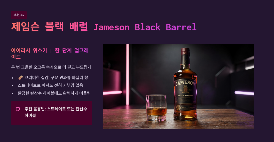 - 검증된 가성비 라인업 선택: 예산 내에서 몽키 숄더, 와일드 터키 101, 에반 윌리엄스 화이트, 제임슨 블랙 배럴 등 목적에 맞는 검증된 바틀을 선택하세요.
