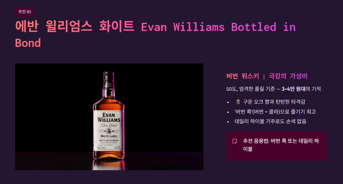 - 추천 음용법: 콜라와 섞어 마시는 '버번 콕'으로 즐기기에 최고의 선택이며, 가성비가 좋아 데일리 하이볼 기주로도 손색이 없습니다.