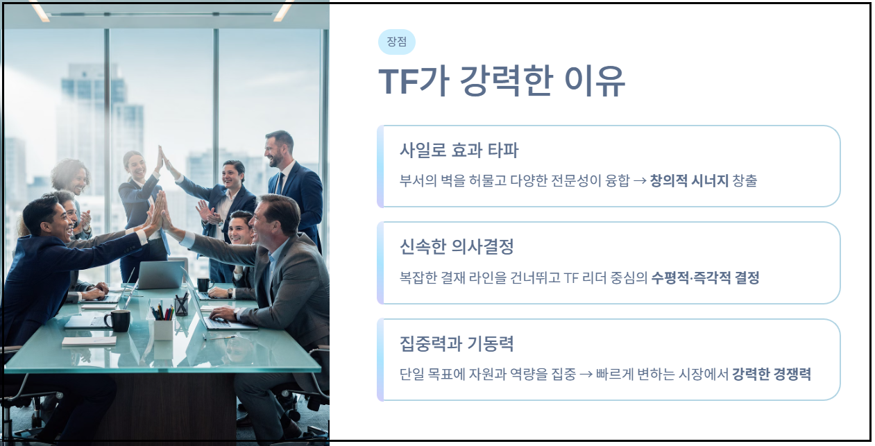 TF 팀은 만능열쇠처럼 보이지만, 실제 조직 내에서 운영될 때는 명암이 뚜렷하게 갈립니다. 경영진의 입장과 실무자의 입장에서 느끼는 장단점을 다각도로 분석해 보겠습니다.