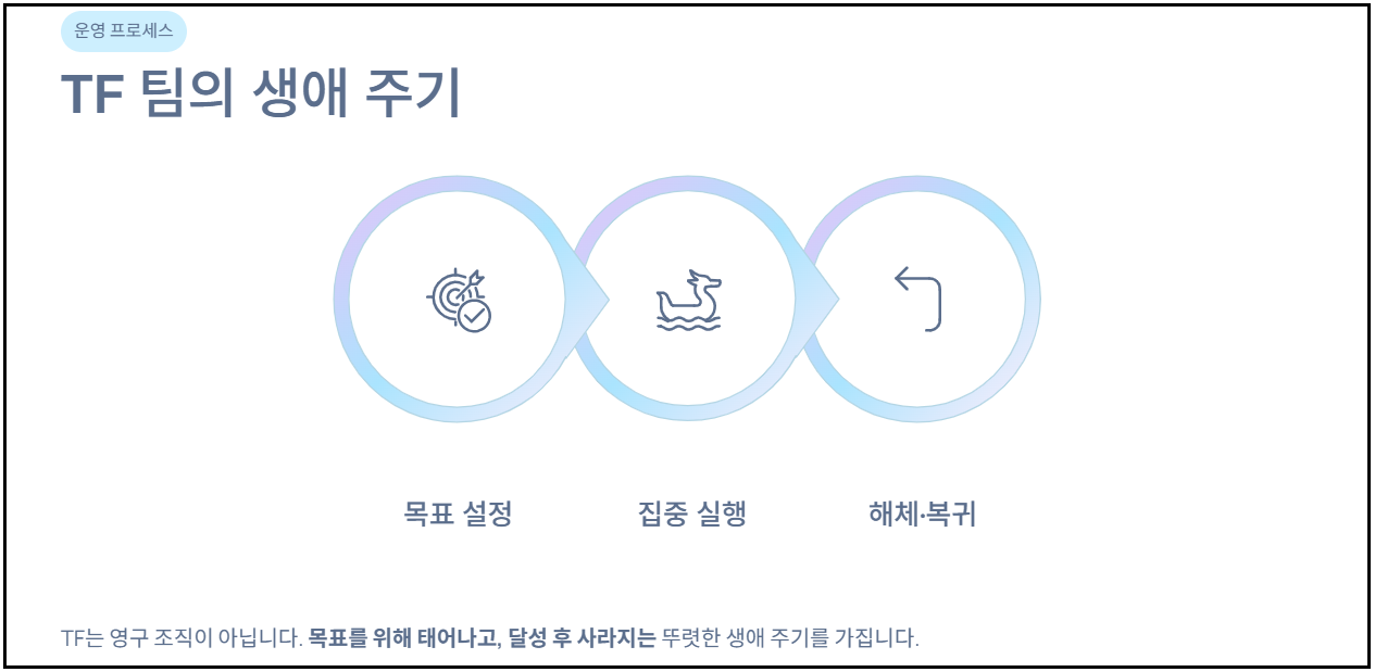 TF 팀은 영원히 유지되는 조직이 아니라, 목표를 위해 잠시 만들어졌다가 사라지는 팀입니다. [목표 설정 및 인원 차출] ➔ [집중적인 문제 해결 및 실행] ➔ [목표 달성 후 해체 및 원소속 복귀]라는 뚜렷한 생애 주기를 가집니다. 프로젝트가 성공적으로 끝나거나 혹은 실패로 결론이 나면 팀은 즉각 해체되고, 팀원들은 본래의 부서로 돌아가 일상 업무를 재개하게 됩니다.