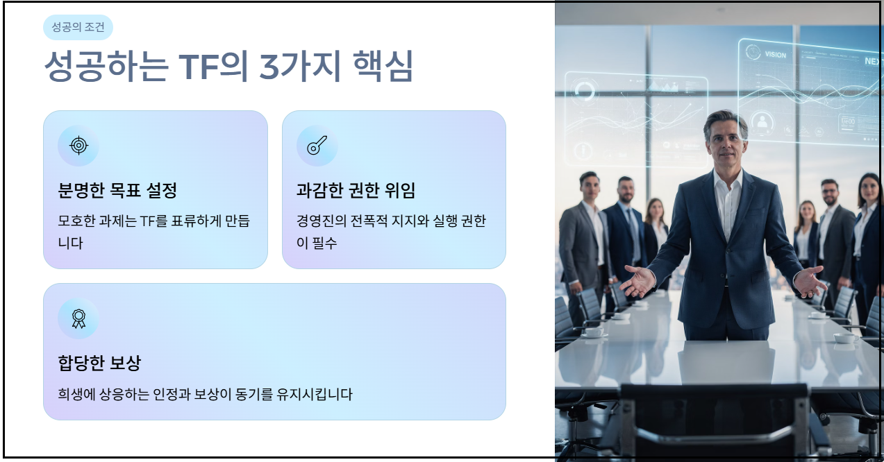 - 조직 내 갈등 유발: 에이스 직원을 TF에 빼앗긴 원래 부서의 불만이 커질 수 있습니다. 또한, TF의 목표가 모호하거나 경영진의 전폭적인 지지(권한 부여)가 없다면, 그저 회의만 반복하다가 흐지부지 해체되는 이른바 '보여주기식 행정'으로 전락할 위험이 큽니다.