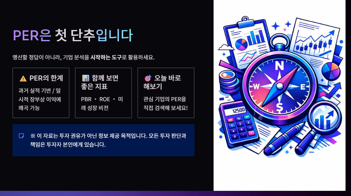 PER은 훌륭한 지표지만, 주식 시장의 모든 것을 설명해 주지는 않습니다. 과거의 실적을 바탕으로 계산되기 때문에 급변하는 미래를 완벽히 예측할 수 없고, 일시적인 장부상 이익(부동산 매각 등)에 의해 수치가 왜곡될 수도 있습니다.