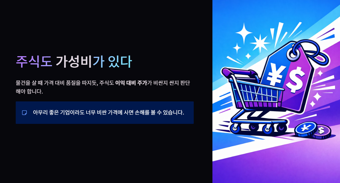 - 가치 투자 관점에서는 안전하고 저렴한 주식을 찾는 지표로 쓰이며, 성장 투자 관점에서는 기업의 미래 가능성에 대한 프리미엄(기대치)으로 해석됩니다.